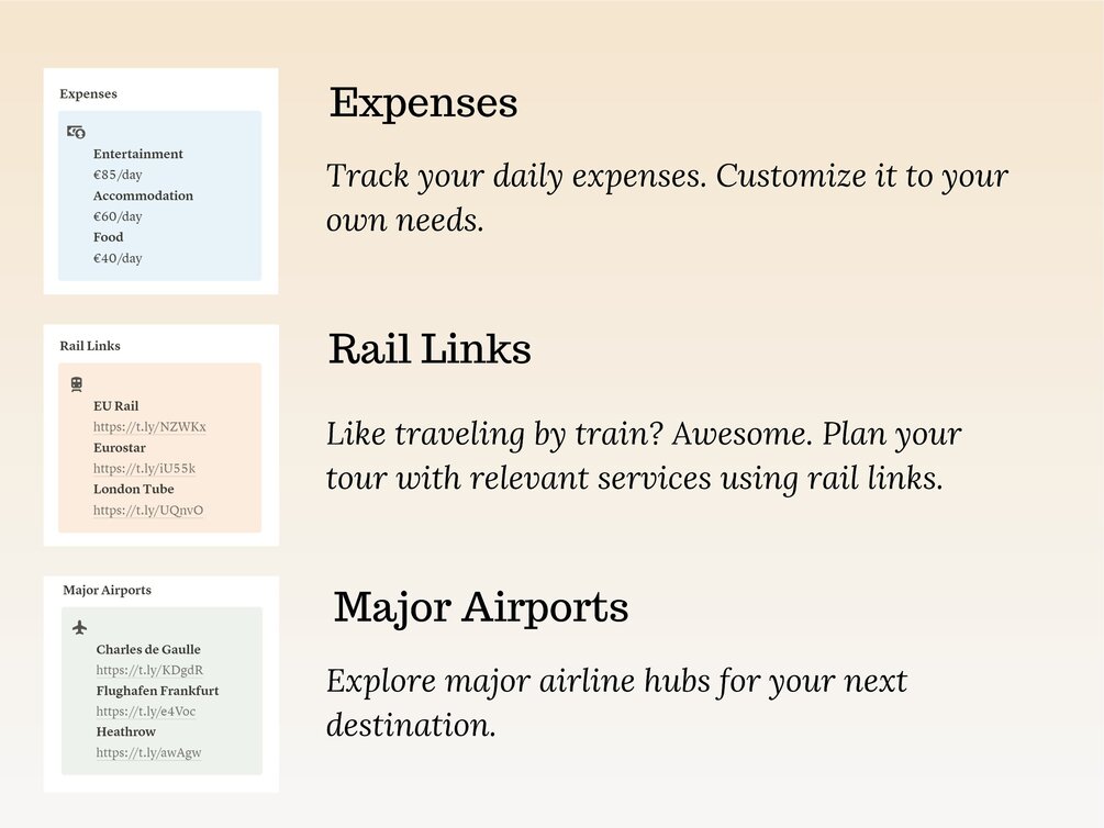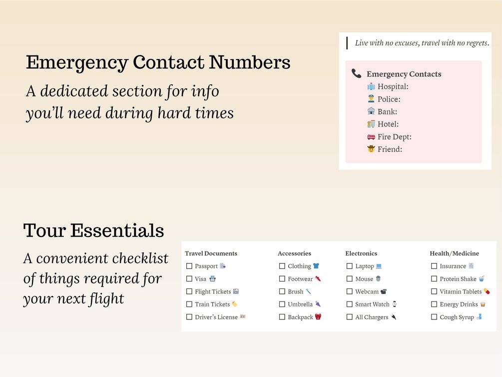 - Tour Essentials: A clear checklist of all essentials before you catch your next flight. Super helpful to keep an eye on easy-to-forget things.