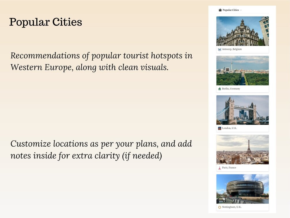 - Popular Cities: Visual recommendations for major tourist hotspots. Add your own favorites, with the ability to include your own notes as well.